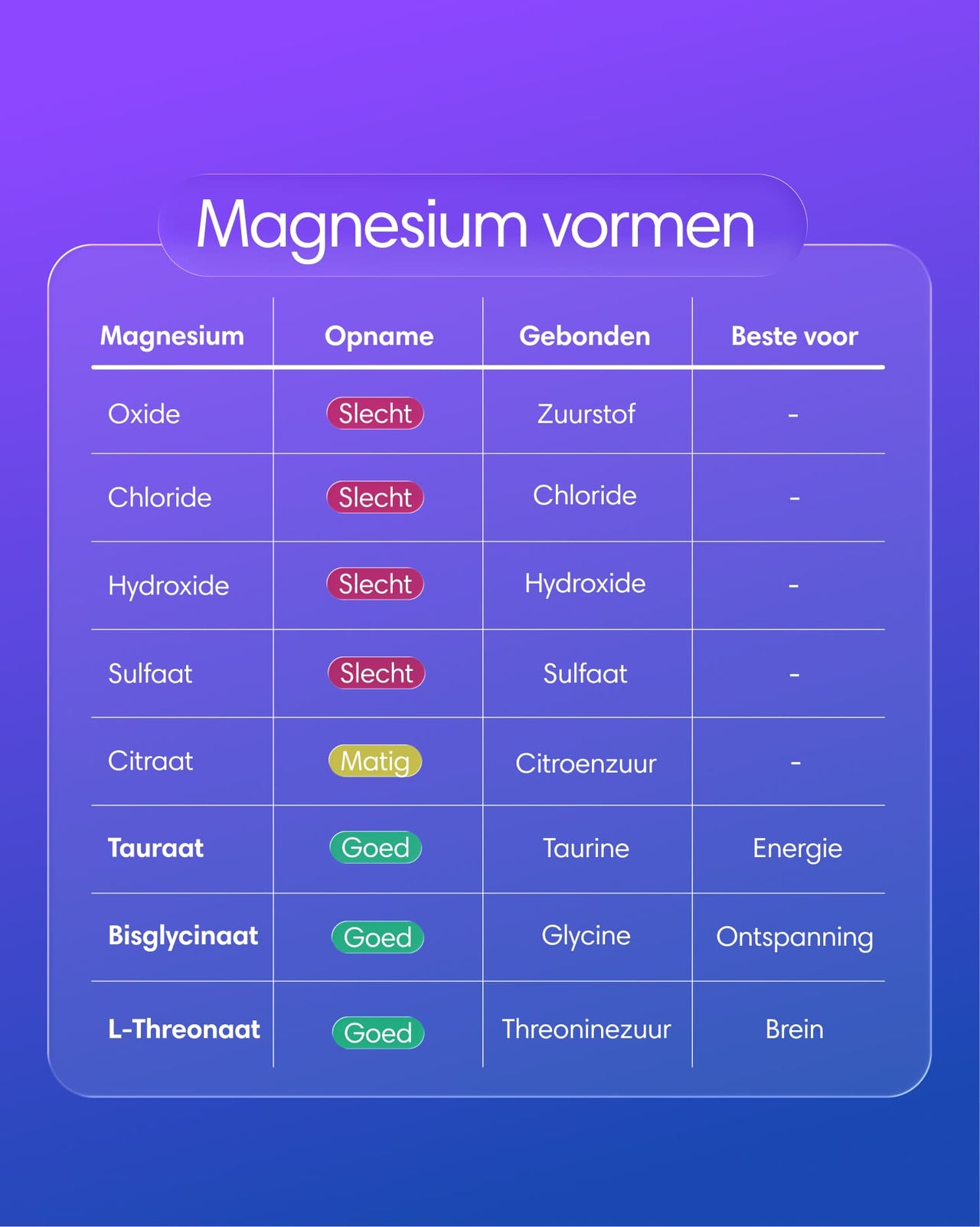 Niet elke vorm werkt even goed. Elke magnesium vorm is gekoppeld aan een andere stof en die combinatie bepaalt hoe goed je het opneemt, waar het in je lichaam terechtkomt en wat het kan doen.